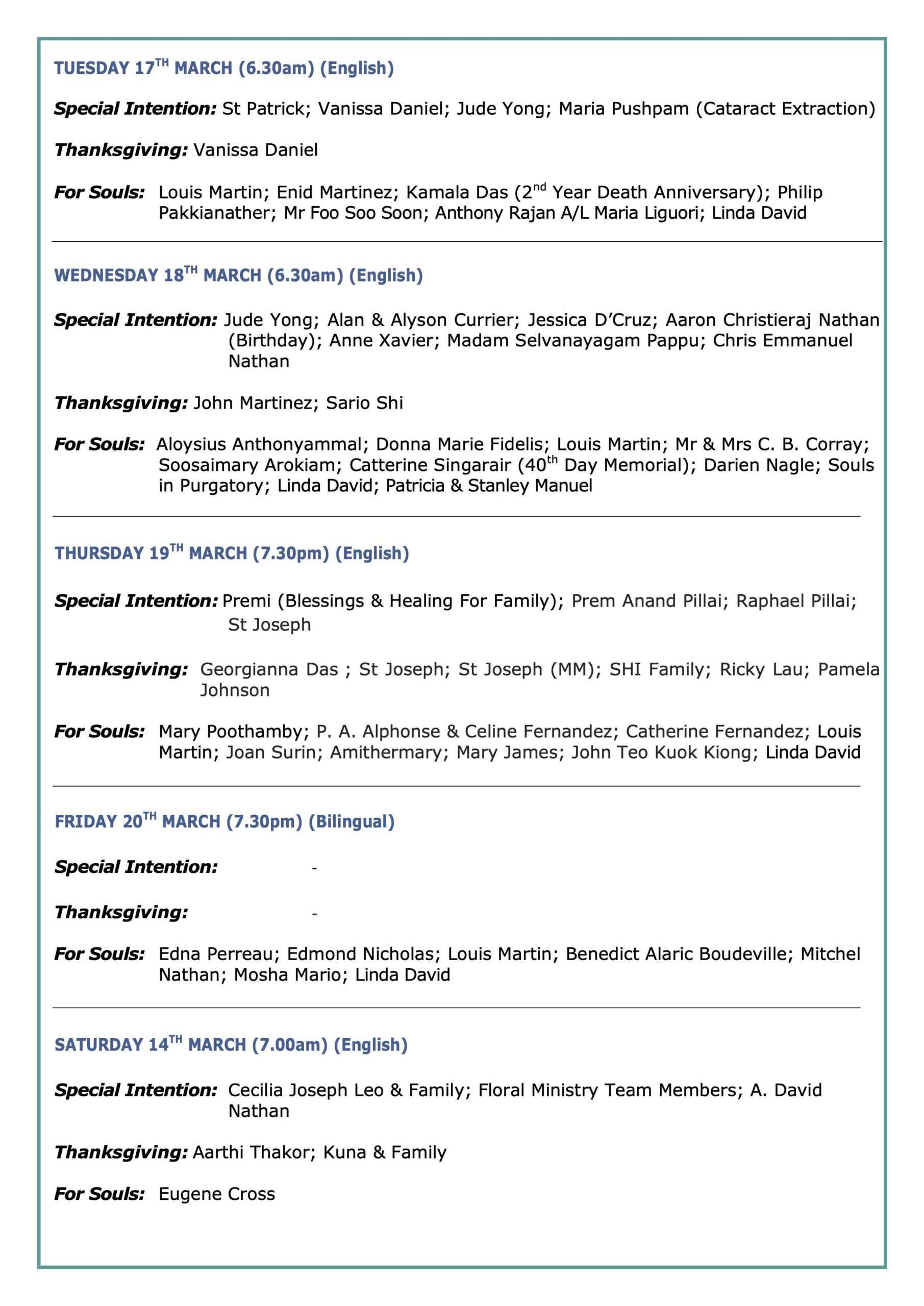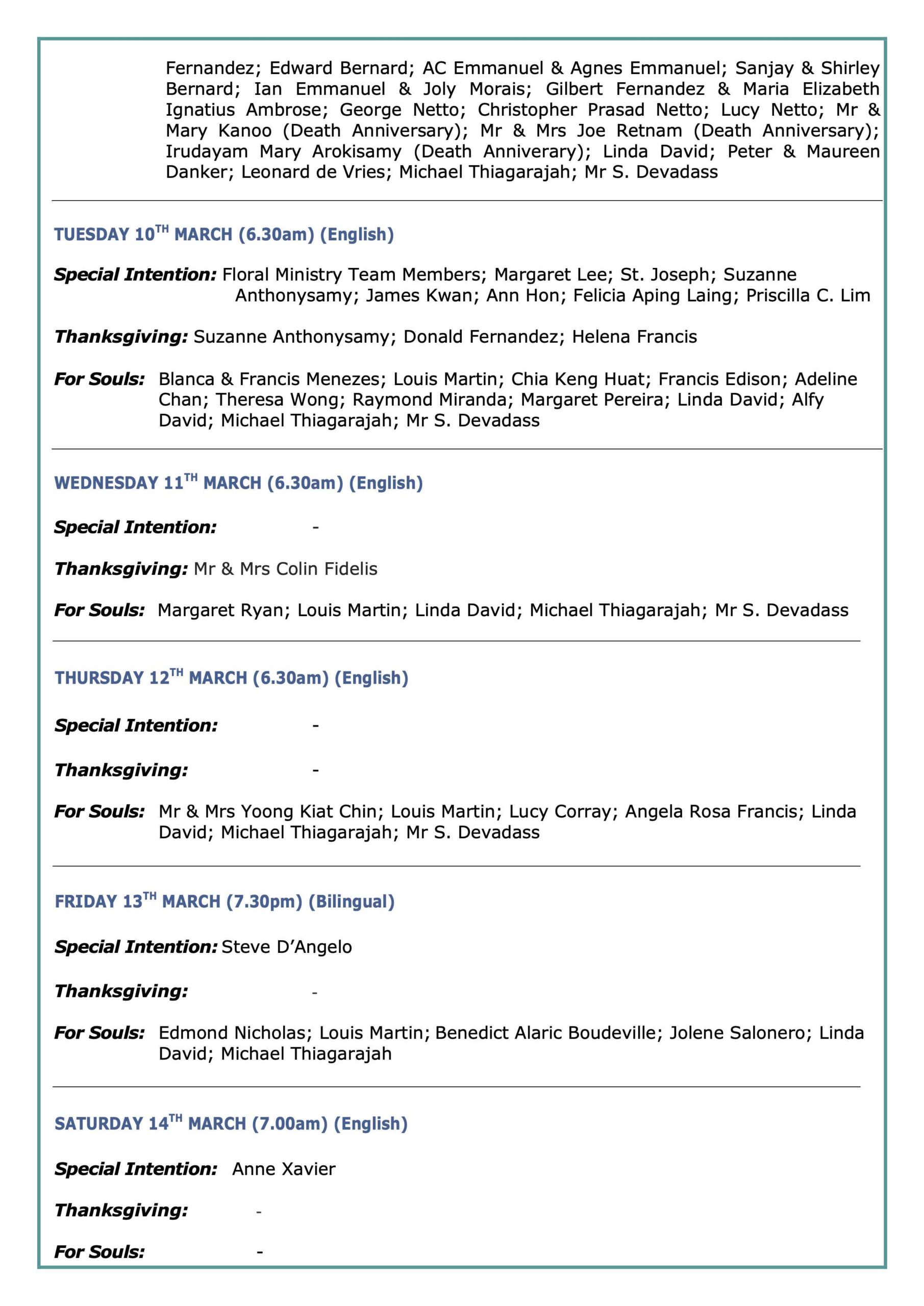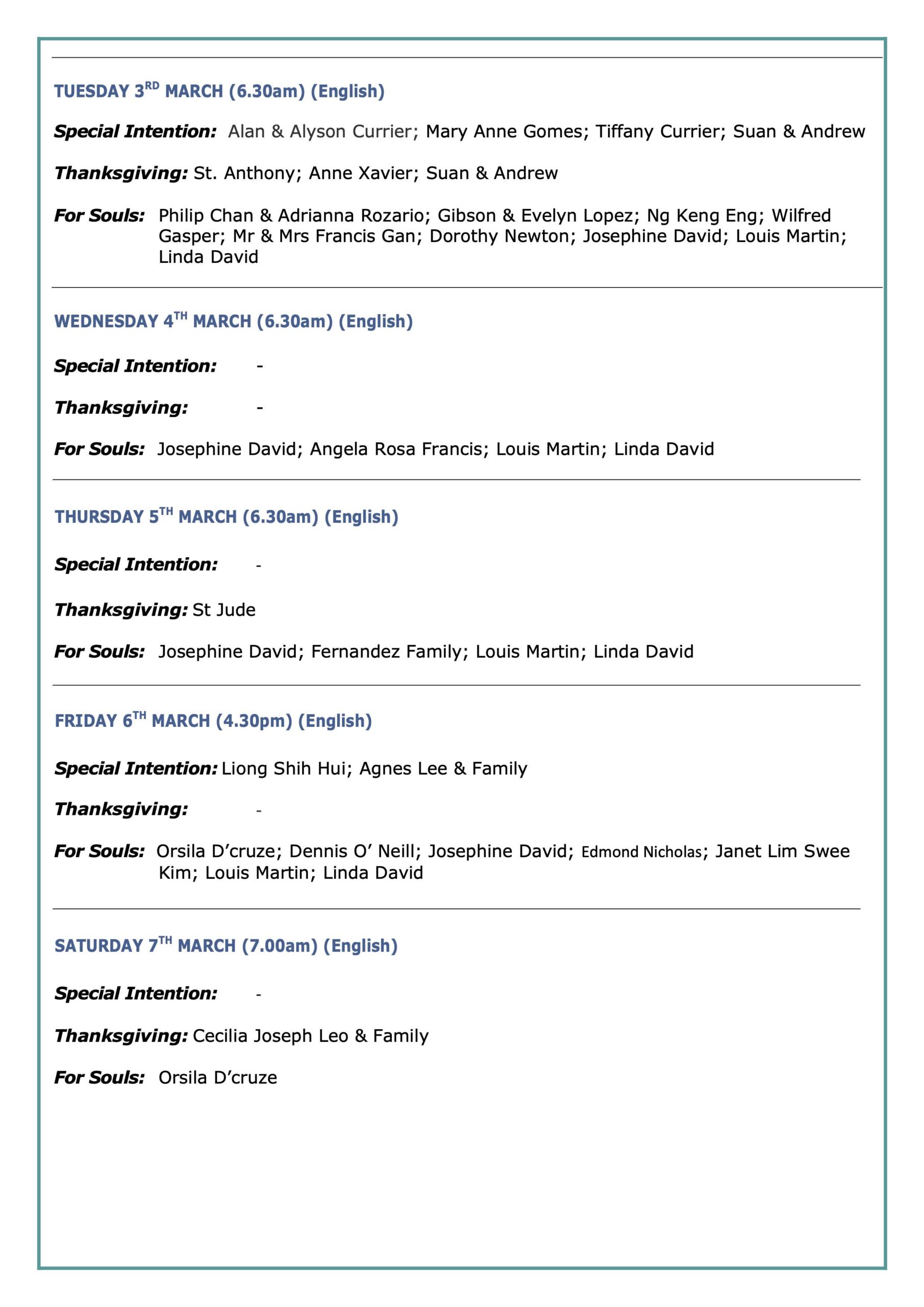 Mass Intentions 14 Mar to 21 Mar 2026 07 Mar to 14 Mar 2026 28 Feb to 07 Mar 2026 21 Feb to 28 Feb 2026 14 Feb to 21 Feb 2026 07 Feb to 14 Feb 2026 31 Jan 2026 to 07 Feb 2026 24 Jan 2026 to 31 Jan 2026 17 Jan 2026 to 24 Jan 2026 11 Jan 2026 to 17 Jan 2026 04 Jan 2026 to 10 Jan 2026 27 Dec 2025 to 03 Jan 2026 20 Dec 2025 to 27 Dec 2025 13 Dec 2025 to 20 Dec 2025 06 Dec 2025 to 13 Dec 2025 29 Nov 2025 to 5 Dec 2025 22 Nov 2025 to 29 Nov 2025 15 Nov 2025 to 22 Nov 2025 08 Nov 2025 to 15 Nov 2025 01 Nov 2025 to 08 Nov 2025 25 Oct 2025 to 01 Nov 2025 18 Oct 2025 to 25 Oct 2025 11 Oct 2025 to 18 Oct 2025 04 Oct 2025 to 11 Oct 2025 26 Sep 2025 to 04 Oct 2025 20 Sep 2025 to 27 Sep 2025 13 Sep 2025 to 20 Sep 2025 06 Sep 2025 to 13 Sep 2025 30 Aug 2025 to 06 Sep 2025 23 Aug 2025 to 30 Aug 2025 16 Aug 2025 to 23 Aug 2025 09 Aug 2025 to 16 Aug 2025 02 Aug 2025 to 09 Aug 2025 26 Jul 2025 to 02 Aug 2025 19 Jul 2025 to 26 Jul 2025 12 Jul 2025 to 19 Jul 2025 05 Jul 2025 to 12 Jul 2025 28 Jun 2025 to 05 Jul 2025 21 Jun 2025 to 28 Jun 2025 14 Jun 2025 to 21 Jun 2025 07 Jun 2025 to 14 Jun 2025 31 May 2025 to 07 Jun 2025 24 May 2025 to 31 May 2025 17 May 2025 to 24 May 2025 10 May 2025 to 17 May 2025 03 May 2025 to 09 May 2025 26 Apr 2025 to 02 May 2025 19 Apr 2025 to 26 Apr 2025 12 Apr 2025 to 17 Apr 2025 05 Apr 2025 to 12 Apr 2025 29 Mar 2025 to 05 Apr 2025 22 Mar 2025 to 28 Mar 2025 08 Mar 2025 to 22 Mar 2025 08 Mar 2025 to 15 Mar 2025 01 Mar 2025 to 08 Mar 2025 22 Feb 2025 to 01 Mar 2025 15 Feb 2025 to 22 Feb 2025 08 Feb 2025 to 15 Feb 2025 01 Feb 2025 to 07 Feb 2025 25 Jan 2025 to 31 Jan 2025 18 Jan 2025 to 25 Jan 2025 11 Jan 2025 to 18 Jan 2025 04 Jan 2025 to 10 Jan 2025 28 Dec 2024 to 03 Jan 2025 21 Dec 2024 to 28 Dec 2024 14 Dec 2024 to 21 Dec 2024 07 Dec 2024 to 14 Dec 2024 30 Nov 2024 to 07 Dec 2024