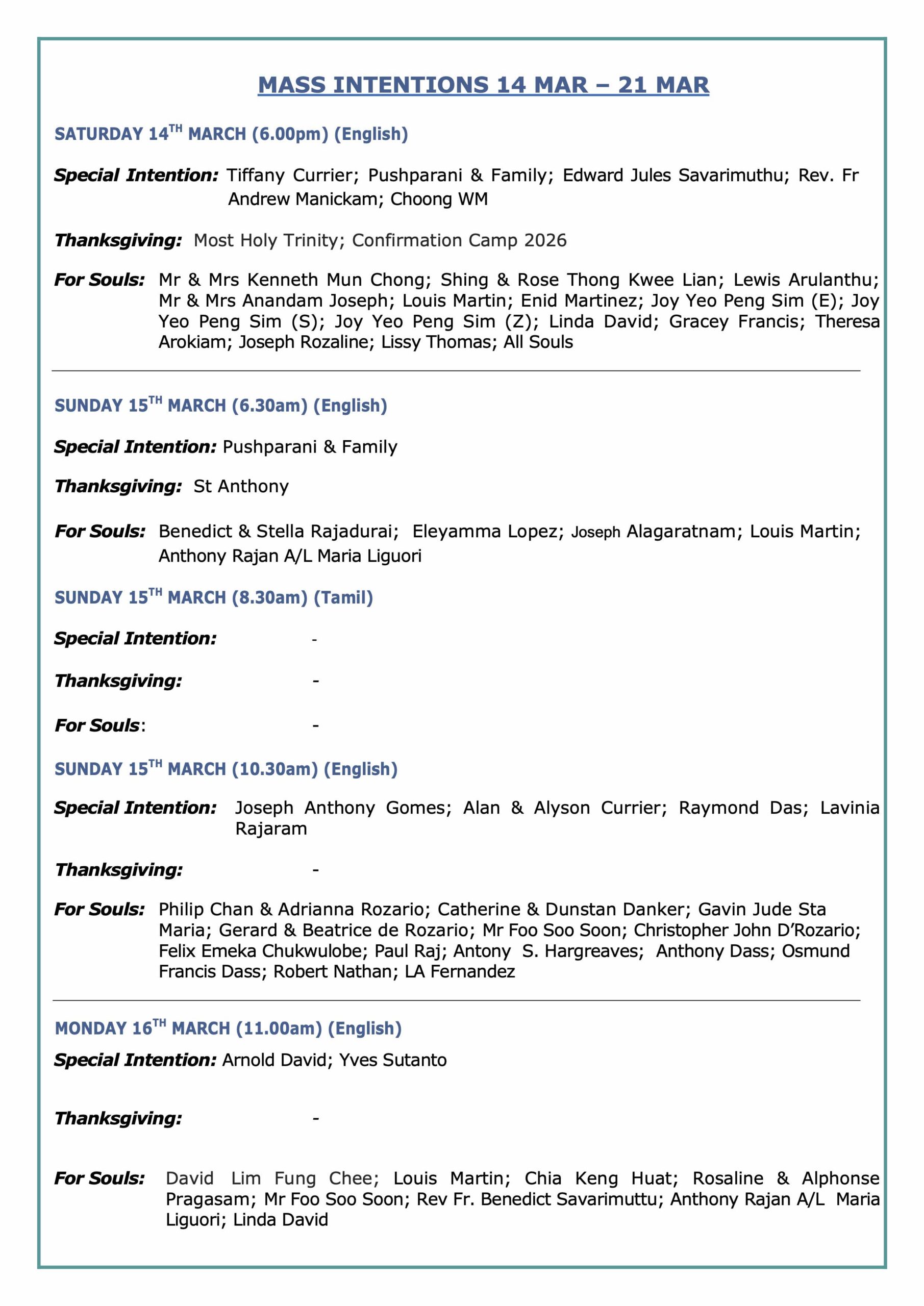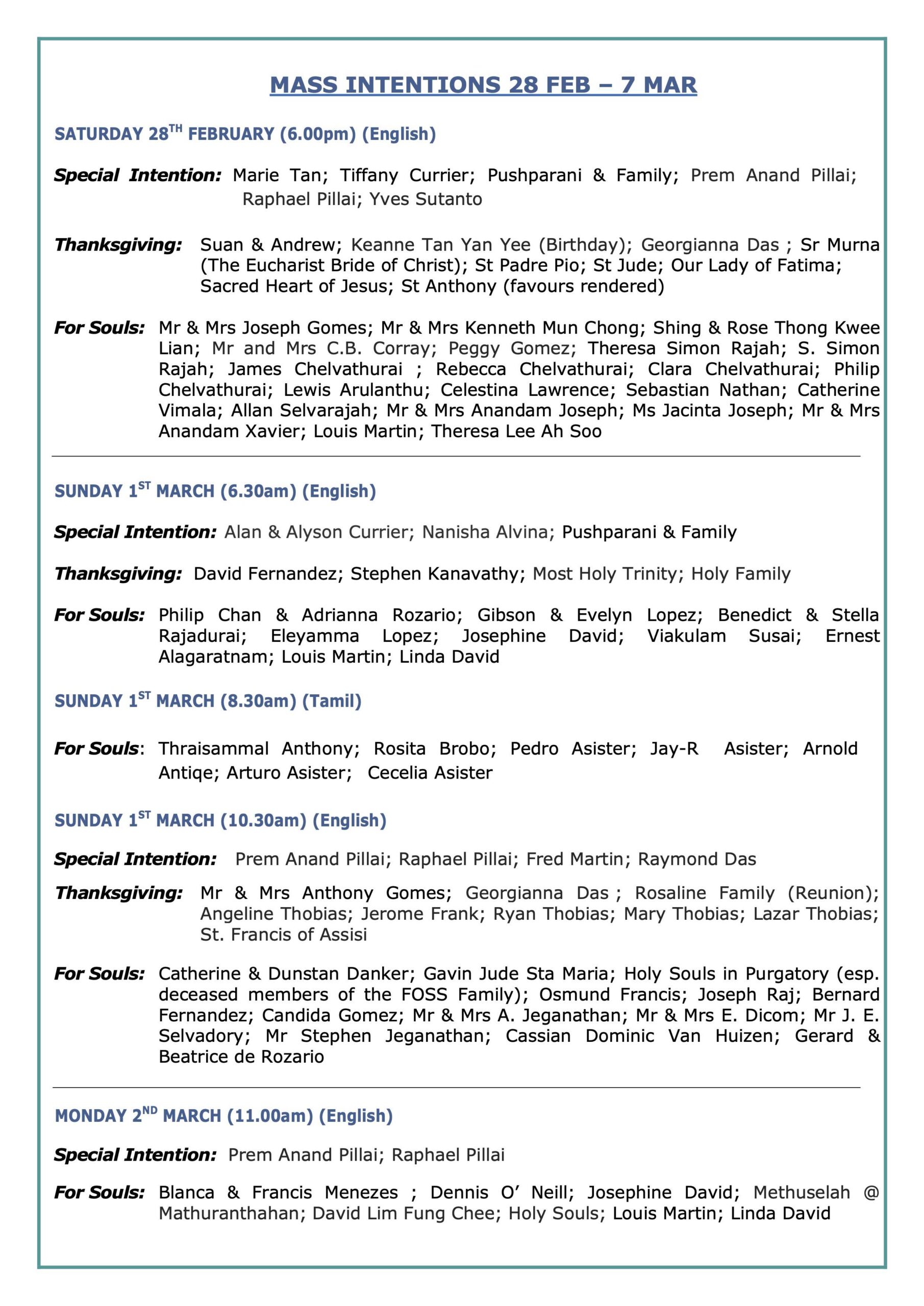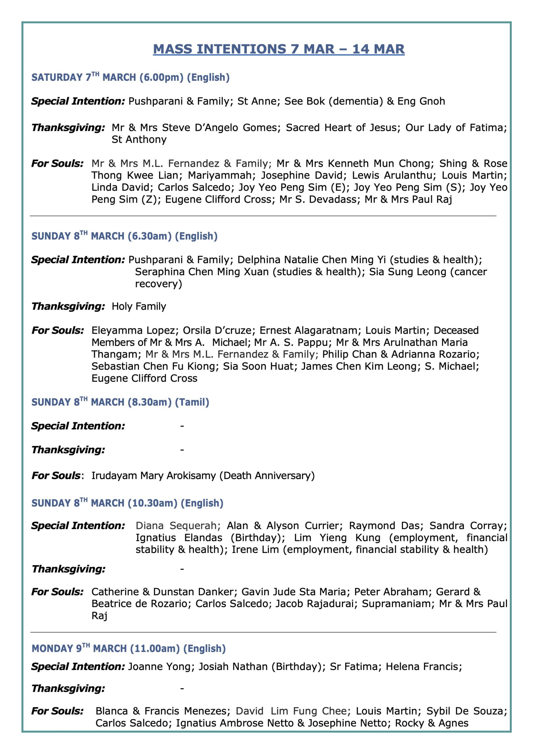 Mass Intentions 14 Mar to 21 Mar 2026 07 Mar to 14 Mar 2026 28 Feb to 07 Mar 2026 21 Feb to 28 Feb 2026 14 Feb to 21 Feb 2026 07 Feb to 14 Feb 2026 31 Jan 2026 to 07 Feb 2026 24 Jan 2026 to 31 Jan 2026 17 Jan 2026 to 24 Jan 2026 11 Jan 2026 to 17 Jan 2026 04 Jan 2026 to 10 Jan 2026 27 Dec 2025 to 03 Jan 2026 20 Dec 2025 to 27 Dec 2025 13 Dec 2025 to 20 Dec 2025 06 Dec 2025 to 13 Dec 2025 29 Nov 2025 to 5 Dec 2025 22 Nov 2025 to 29 Nov 2025 15 Nov 2025 to 22 Nov 2025 08 Nov 2025 to 15 Nov 2025 01 Nov 2025 to 08 Nov 2025 25 Oct 2025 to 01 Nov 2025 18 Oct 2025 to 25 Oct 2025 11 Oct 2025 to 18 Oct 2025 04 Oct 2025 to 11 Oct 2025 26 Sep 2025 to 04 Oct 2025 20 Sep 2025 to 27 Sep 2025 13 Sep 2025 to 20 Sep 2025 06 Sep 2025 to 13 Sep 2025 30 Aug 2025 to 06 Sep 2025 23 Aug 2025 to 30 Aug 2025 16 Aug 2025 to 23 Aug 2025 09 Aug 2025 to 16 Aug 2025 02 Aug 2025 to 09 Aug 2025 26 Jul 2025 to 02 Aug 2025 19 Jul 2025 to 26 Jul 2025 12 Jul 2025 to 19 Jul 2025 05 Jul 2025 to 12 Jul 2025 28 Jun 2025 to 05 Jul 2025 21 Jun 2025 to 28 Jun 2025 14 Jun 2025 to 21 Jun 2025 07 Jun 2025 to 14 Jun 2025 31 May 2025 to 07 Jun 2025 24 May 2025 to 31 May 2025 17 May 2025 to 24 May 2025 10 May 2025 to 17 May 2025 03 May 2025 to 09 May 2025 26 Apr 2025 to 02 May 2025 19 Apr 2025 to 26 Apr 2025 12 Apr 2025 to 17 Apr 2025 05 Apr 2025 to 12 Apr 2025 29 Mar 2025 to 05 Apr 2025 22 Mar 2025 to 28 Mar 2025 08 Mar 2025 to 22 Mar 2025 08 Mar 2025 to 15 Mar 2025 01 Mar 2025 to 08 Mar 2025 22 Feb 2025 to 01 Mar 2025 15 Feb 2025 to 22 Feb 2025 08 Feb 2025 to 15 Feb 2025 01 Feb 2025 to 07 Feb 2025 25 Jan 2025 to 31 Jan 2025 18 Jan 2025 to 25 Jan 2025 11 Jan 2025 to 18 Jan 2025 04 Jan 2025 to 10 Jan 2025 28 Dec 2024 to 03 Jan 2025 21 Dec 2024 to 28 Dec 2024 14 Dec 2024 to 21 Dec 2024 07 Dec 2024 to 14 Dec 2024 30 Nov 2024 to 07 Dec 2024